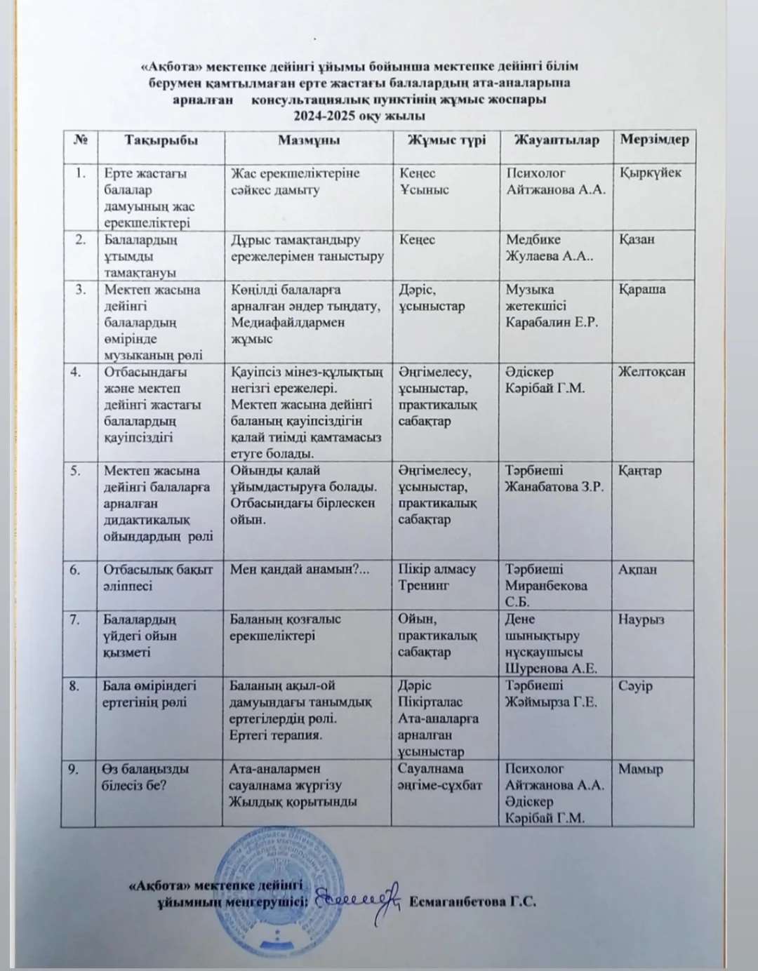 "Ақбота" мектепке дейінгі ұйымында балалардың дұрыс тамақтануы тақырыбында ата-аналармен түсіндіру жұмыстары жүргізілді. Қазан айының жоспары барысында маман балаларға арналған пайдалы тағам түрлері, дұрыс тамақтану ережелері және күнделікті ас мәзірін құрастыру жолдары туралы жан-жақты мәлімет берді. Ата-аналардың сұрақтарына жауап беріліп, ұсыныстар айтылды.