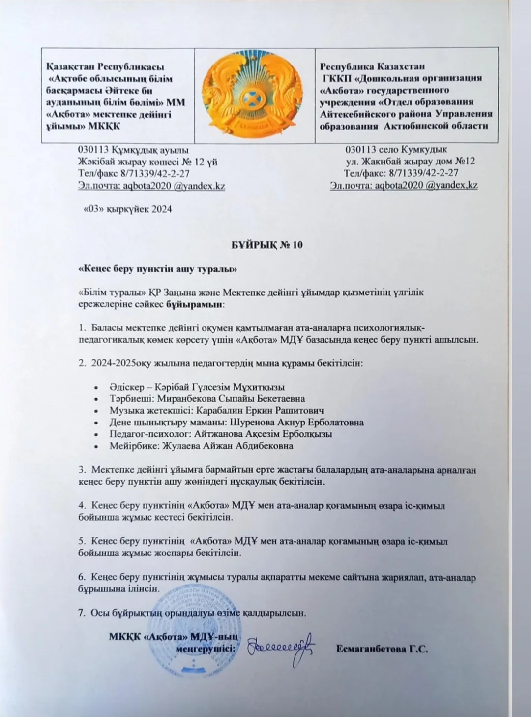 "Ақбота" мектепке дейінгі ұйымында ата-аналарға кеңес беру пунктінің қыркүйек айының жоспарына сәйкес "Отбасылық бақтың әліппесі" тақырыбында жан-жақты тренинг өткізіліп, ата-аналармен кең көлемде пікір алмасу ұйымдастырылды.